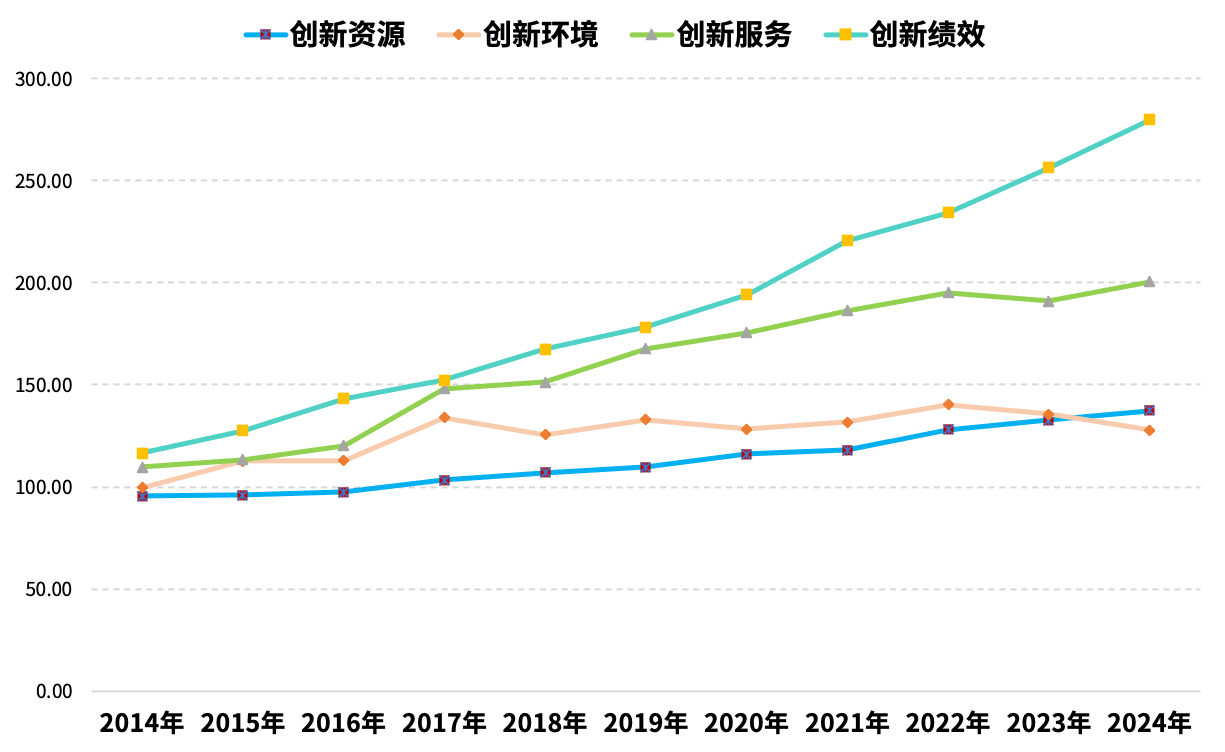 从分项指数来看,2014年到2024年,四项一级指标的得分都有所提升。其中,创新绩效一级指标增长最为明显,总体增幅达140.17%,从116.53分增长到279.87分,年均增长16.33分;创新服务总体增幅达82.99%,从109.59分增长到200.54分,年均增长9.10分;创新资源总体增幅达44.01%,从95.43分增长到137.43分,年均增长4.20分;创新环境总体增幅达28.26%,从99.68分增长到127.85分,年均增长2.82分。