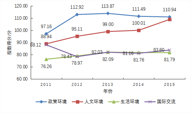从测算结果看,首都创新环境指数大幅增长,创新环境发展良好,得分从2011年的88.66分增长到2015年的97.82分,总体呈现不断上升趋势。具体到各二级指标:政策环境得分从2011到2015年有所增长,得分从97.16分增长到110.94分,该指标在2012年得分破百,并一直保持至今。2011-2015年,首都人文环境得到显著改善,人文环境指标得分总体上保持了较快的增长势头,四年间得分增长了19.96分,年均增长4.99分。2015年,该指标得分108.9,同比增长8.9%,达到“十二五”时期新高。生活环境指标近两年略有下降,但得分总体保持稳定,从2011年的76.26分增长到2015年的81.79分,年均增长1.38分。2011年-2015年,国际交流指标总体呈现平稳发展的态势,2015年该指标得分比上年提高2.64分。