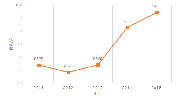 图2 2011-2015年每万名科技活动人员占有的市级及以上科技创新平台数