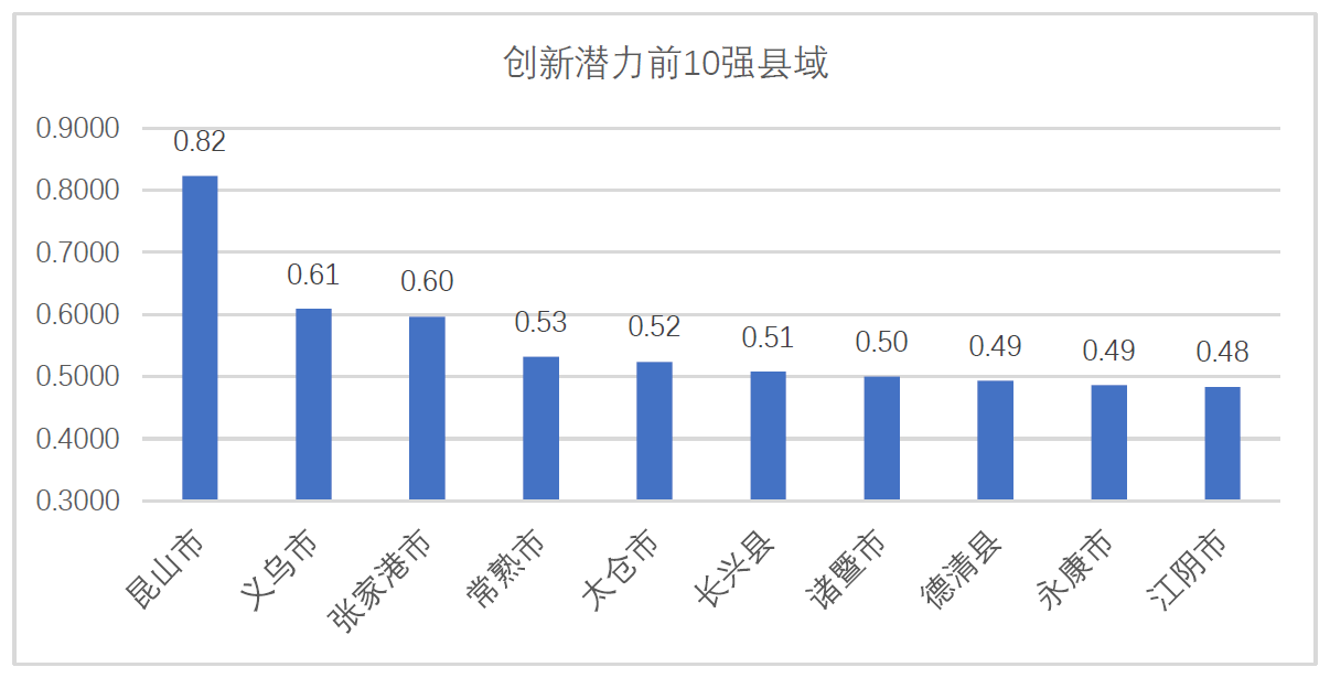创新潜力前10强的县域分别为昆山市、义乌市、张家港市、常熟市、太仓市、长兴县、诸暨市、德清县、永康市、江阴市。
