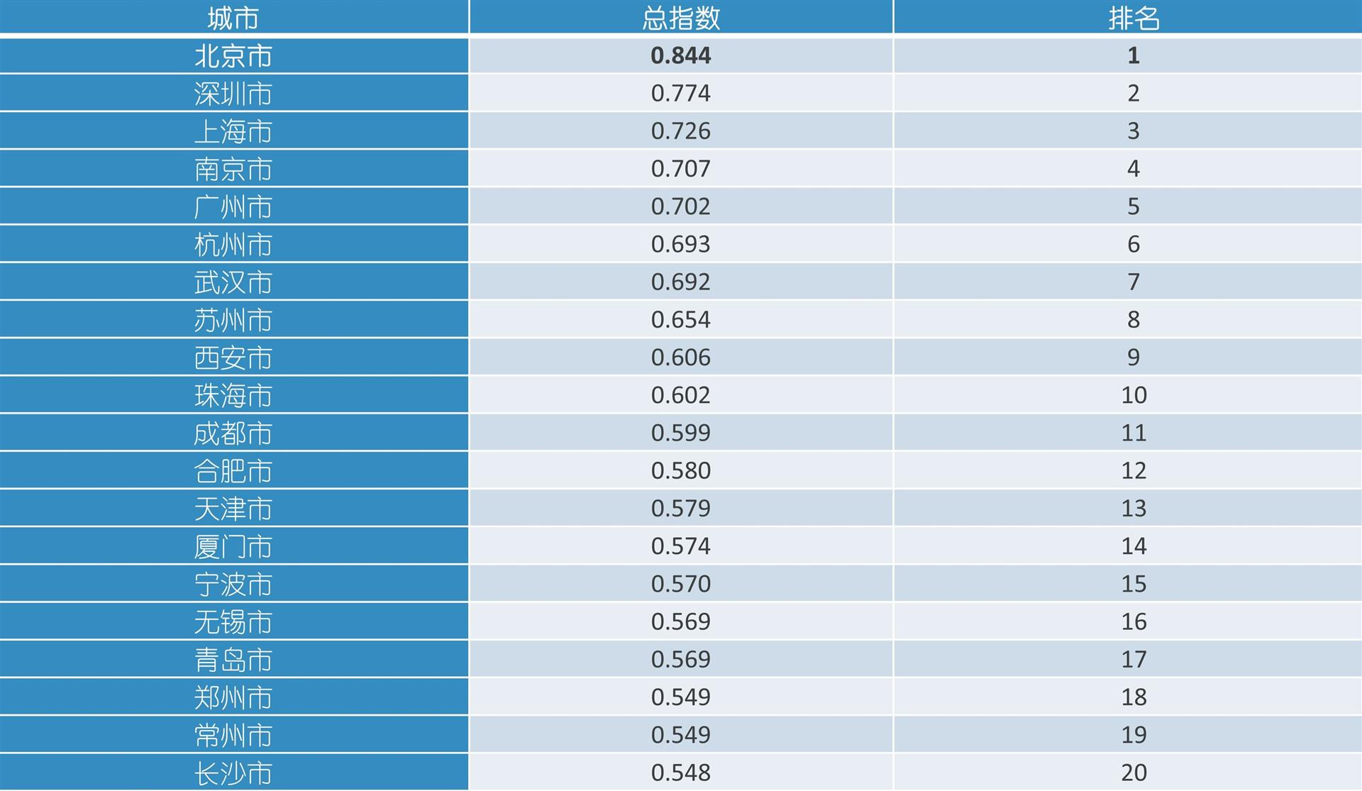 《中国城市科技创新发展报告(2021)》显示,2021年度中国城市科技创新发展指数排名前20位的城市依次是北京市、深圳市、上海市、南京市、广州市、杭州市、武汉市、苏州市、西安市、珠海市、成都市、合肥市、天津市、厦门市、宁波市、无锡市、青岛市、郑州市、常州市和长沙市。