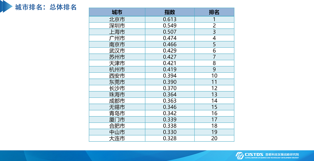 在289个城市科技创新指数排名中,北京位列第一。报告显示,北京作为全国科技创新中心的实力凸显,创新资源、创新服务和创新绩效三个一级指标均排名第一,支撑创新型国家建设作用不断增强。