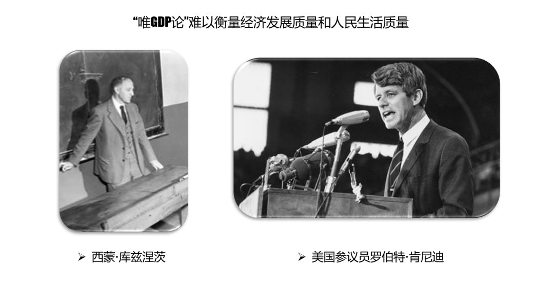 1934年,西蒙·库兹涅茨在向美国国会提交新国民账户(GDP前身)时,就提出警告:“一个国家的福利如何,几乎无法从国民收入的数量来判断。”1968年,美国参议员罗伯特·肯尼迪对GDP进行了公开批评:“在GDP中,大气污染、香烟广告、为救助交通事故负伤者而出动的救护车,都被作为经济效益计算进去了。但是,GDP不包括孩子们的健康状况、教育质量和游戏的快乐,也不包括诗歌的优美、公共辩论的智慧和公务员的廉正……总之,它测算一切,但是真正使生命有意义的东西却被排除在外。”
