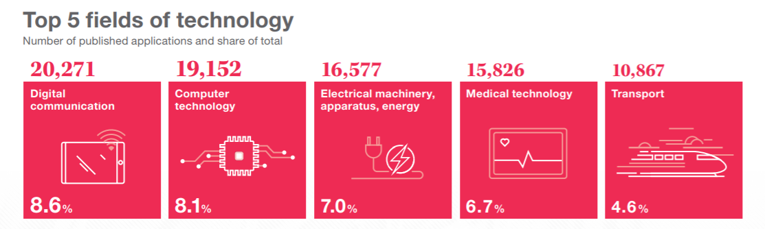 图4:电子通信成为专利数量最多的领域(来源:WIPO)