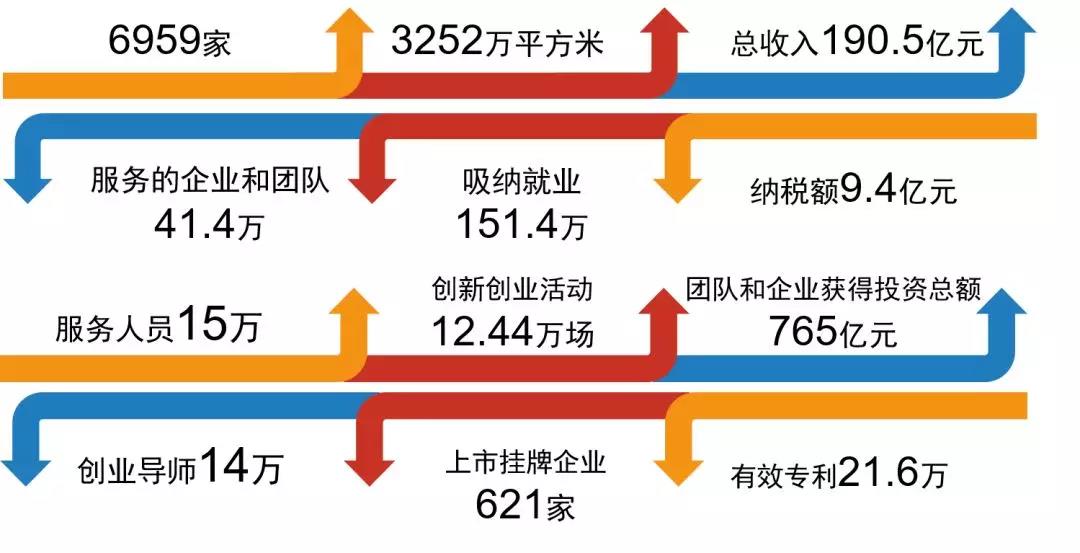 2018年众创空间发展全貌:全国共有众创空间6959家,面积3252万平方米,众创空间总收入190.5亿元,纳税额9.4亿元。服务的企业和团队41.4万家,吸纳就业151.4万人,团队和企业获得投资总额765亿元,上市挂牌企业621家,拥有有效知识产权21.6万件。众创空间拥有服务人员15万人,创业导师14万人。