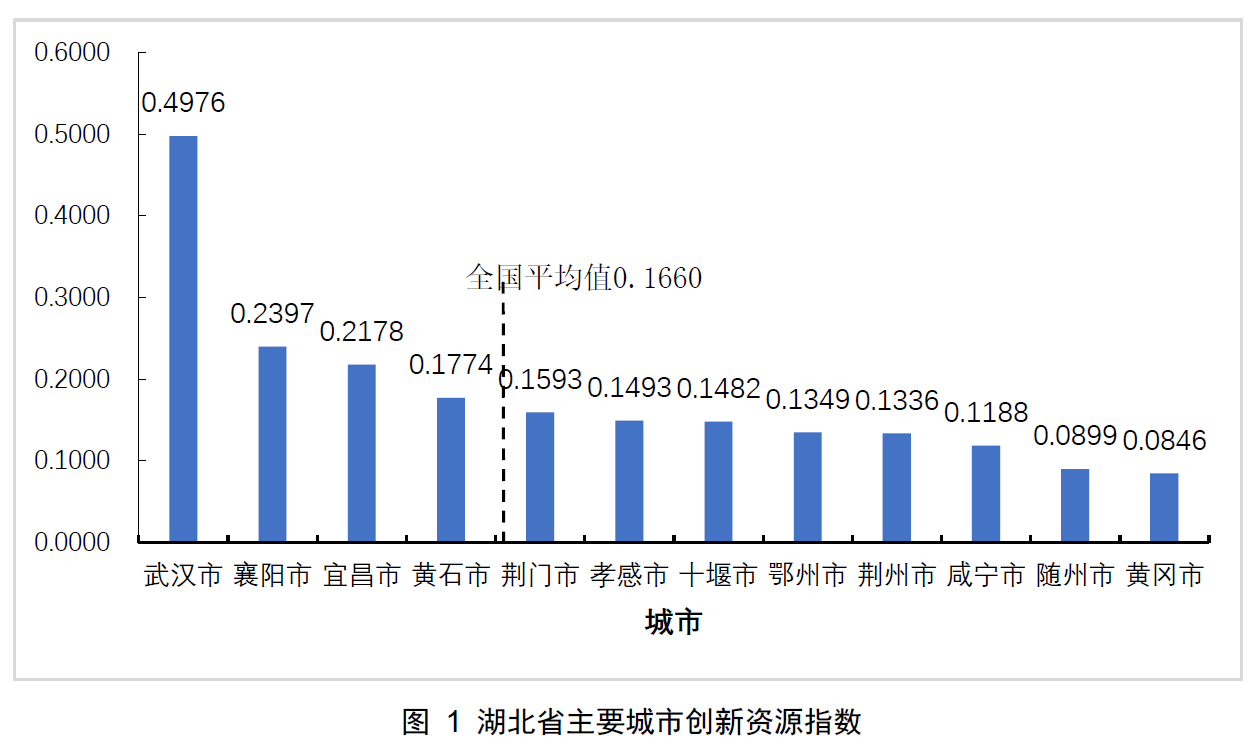 在创新资源一级指标中,湖北省各市的排名依次为:武汉、襄阳、宜昌、黄石、荆门、孝感、十堰、鄂州、荆州、咸宁、随州和黄冈。其中武汉、襄阳、宜昌、黄石四市创新资源指数高于全国均值,荆门及排名在其后的城市的创新资源指数均低于全国均值。