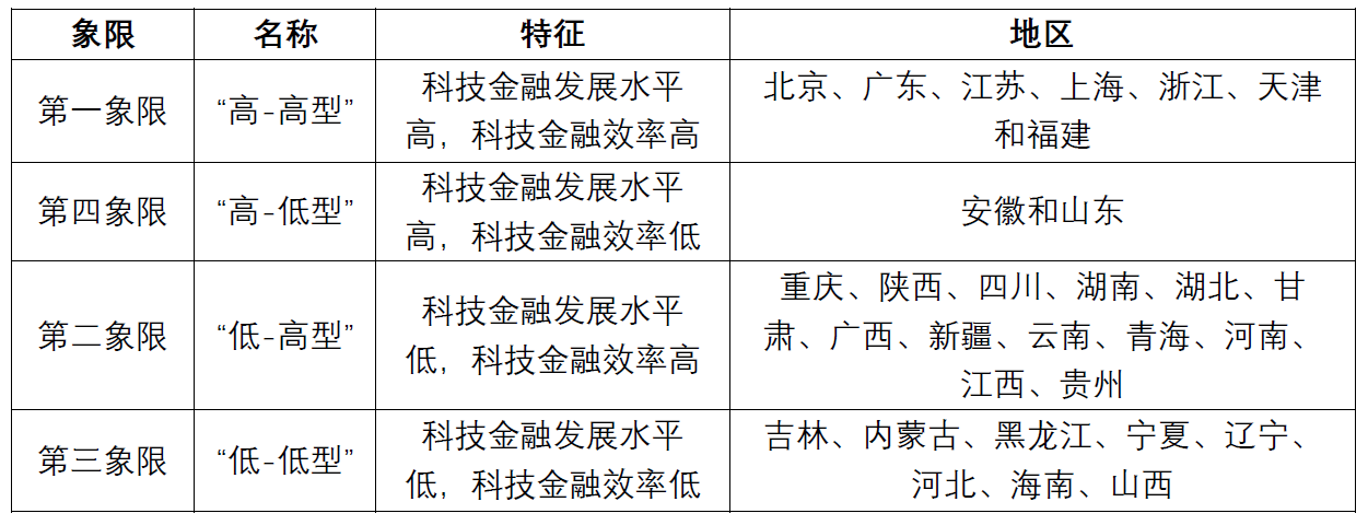 位于第三象限,是科技金融发展水平和科技金融发展效率均不高的地区,包括吉林、内蒙古、黑龙江、宁夏、辽宁、河北、海南、山西共8个地区,除海南以外,主要位于东北和华北地区,这几个省份科技金融资源较少,而且科技金融资源的利用程度也较低。